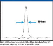 The faster data-acquisition electronics in modern GC–MS make fast chromatographic analysis feasible with a quadrupole-based GC–MS system. Capillary columns with internal diameters of 100 μm can produce peaks with one-half height widths of 180 ms and should contain more than eight data points for acceptable quantitation. Figure 3 shows the peak profile that was obtained using a 3-ms dwell time/ion. A total of 15 data points were obtained for this peak while three other SIM ions were being acquired during the analysis.