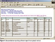 The analysis of a spinach extract is shown in Figure 6. Typically, a human operation would take 45–60 min to analyze the extract and perform a library search for the major components. Using the combined AMDIS and a retention time and spectral library of 567 pesticides, the report shown in Figure 7 was produced in 1 min. Additional compound libraries are available for volatiles, semivolatiles, PCBs, and pesticides.