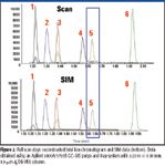 A method that is designed primarily for qualitative analysis using full-scan spectra can now be combined with SIM acquisition to provide quantitative information on selected compounds via SIM, with significantly improved sensitivity. In an analogous manner, an experiment that is designed primarily for quantitative information via SIM can have full-scan data incorporated into the method. One benefit of this SIM–scan combination is that qualitative information can be collected during a SIM–scan analysis that helps in identifying coeluted compounds that could interfere with the quantitative SIM analysis. The coelution of matrix compounds from a complex sample that could interfere with a SIM analysis could be detected easily and confirmed via the scanned spectrum.