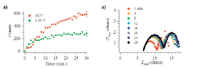 To verify the correlation between the electrochemical and the in situ Raman measurements, polarization studies were performed to look at the effect that changes in current and voltage would have on the impedance and in situ spectroscopic measurements of these devices (Figure 6). Polarizing the SOFC increases the current being drawn across the device, which drives the fuel oxidation mechanisms in the forward direction as a result of an increase in the oxide anion flux through the electrolyte to the anode. Under these conditions, the increase in oxide anion concentration at the anode might aid in the oxidation of unwanted graphite that is present on the anode. In situ Raman data shown in Figure 6a independently confirms this assertion by observing the "G" band graphite growth kinetics for the SOFC operated at OCV and polarized to 0.30 V. The kinetic traces show a clear reduction in the total amount of graphite formed as the cell is subjected to the higher overpotential. Graphite formed from methanol shows a threefold reduction in the 1560 cm-1 feature at 0.30 V polarization as compared to OCV. A direct correlation between the electrochemical and spectroscopic measurements is observed when concurrent EIS measurements are performed with the in situ Raman measurements, Figure 6b. There is an initial increase in capacitance and resistance of the device from 1 to 4 min, followed by a minimal increase in these resistive elements as fuel exposure continues from 5 to 30 min. In Figure 6a, it is also observed that there is an initial fast graphite growth mechanism from 1 to 4 min that seems to slow after 4 min. Comparing the EIS to the Raman data for these polarization studies, it is observed that there is a direct correlation to graphite growth and electrochemical performance.