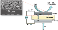 SOFCs rely on the electrochemical oxidation of a fuel to provide an electrical current (1,6–19). In the most general sense, the overall chemistry occurring in SOFCs converts a fuel into products and electricity in the presence of oxide ions that have already been electrochemically reduced (1,6–19). The SOFC device consists of three principal components: an electrolyte and two electrodes (anode and cathode), as shown in Figure 1 (1–3,20). The oxide ions arrive at the anode after diffusing through vacancies in the electrolyte matrix (6,21–28). Oxidation of the fuel is thought to happen at the three-phase boundary (TPB), the region where the ionically conducting electrolyte, the electronically conducting anode, and the gas-phase fuel mixture meet (9,11,29–33). At the TPB, electrons are carried away into the circuit and arrive at the cathode where they reduce the adsorbed oxygen atoms to form O2- (2,6,7,9). An important point to note, however, is that these proposed mechanisms are speculative and are not experimentally validated. The high operating temperatures of SOFCs and inaccessible device architectures make it extremely difficult to validate proposed kinetic models because of lingering questions about the fundamental reactions occurring on the surfaces of SOFC materials.