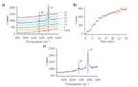 While electrochemical methods can explore the performance of the SOFC as a function of fuel exposure, these techniques cannot identify with material or molecular specificity of the species present. Optical spectroscopy, vibrational in particular, is uniquely well suited for in situ observation of specific molecular and material species. Figure 5 shows a sequence of vibrational Raman spectra that indicate the relative amounts of carbon (graphitic) on Ni/YSZ cermet anodes held at OCV and exposed to a direct methanol fuel feed. Several observations stand out. First, the strongest feature observed in both series of spectra is a sharp band at ~1560 cm-1. This feature is associated with the "G" band of graphite in the literature and is characteristic of highly ordered, sp2 hybridized, graphite having very few defects or grain boundaries (45). The fact that this feature appears provides definitive evidence that methanol is capable of forming carbon deposits on the Ni/YSZ cermet anodes and that these carbon deposits are likely responsible for the changes that were observed in the electrochemical measurements. Figure 5b plots the intensity of the 1560 cm-1 band as a function of fuel exposure in 1 min intervals. Graphite growth appears to be self-limiting as the growth of the "G" band approaches an asymptotic limit after ~25 min. A closer look at the graphite growth kinetics, for methanol as a fuel, reveals that it follows a two-step mechanism; one step occurring from 0 to 5 min of earlier fuel exposure and then a more aggressive growth from 5 to 30 min. Starting at ~15 min, Raman spectra (shown in Figure 5a) begin to show a second feature growing in at ~1340 cm-1. In Figure 5c, higher sensitivity spectra with longer acquisition times verified the presence of this small feature. This feature is assigned to the graphite "D" band and is attributed to disordered carbon with a large number in site defects, grain boundaries, and sp3 hybridization. Carbon with sp3 hybridization allows disordered graphite to form in nonplanar sheets as compared to the extended planar sheets of the sp2 carbon that gives rise to ordered "G" graphite. We speculate that the emergence of the disordered graphite could be responsible for the second growth mechanism seen in Figure 5b.