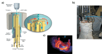 Details regarding the construction of this apparatus have been described previously (8,45,47,48). Alumina paste was used to attach the SOFC membrane–electrode assembly (MEA) atop an alumina tube that was encased inside an optically transparent quartz tube so that in situ Raman measurements could be performed on the anode surface. A network of alumina tubes were used to direct specific gas flows to the anode and cathode. The whole system was surrounded by a split tube furnace to maintain SOFC surface temperatures of 715 °C, while also allowing for optical viewing for the Raman spectrometer. The Raman assembly uses custom-built microscope optics that are used both for excitation and collection of scattered radiation normal to the anode. In the Raman scattering experiments, 488-nm light (8 mW) was focused onto the anode, and backscattered light was collected and sent to the charged couple device (CCD) detector (Renishaw, inVia). Temperatures were maintained by positioning the anode near the top of an open-ended tube furnace and heating the center of the furnace to 1000 °C. In the experiments presented below, vibrational Raman spectra from SOFC anodes were acquired continuously and simultaneously with temporal resolution of 60 s. A schematic of this device and incorporation into the Raman instrument can be seen in Figure 2.