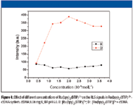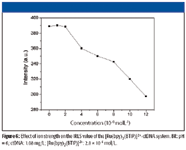 The effect of [Ru(bpy)2 (BTIP)]2+ concentration on IRLS of the [Ru(bpy)2 (BTIP)]2+ -ctDNA system is investigated and shown in Figure 4. The [Ru(bpy)2(BTIP)]2+ concentration has an obvious effect on IRLS of the [Ru(bpy)2 (BTIP)]2+ -ctDNA system. The IRLS increases with the increasing concentration of [Ru(bpy)2 (BTIP)]2+. Yet when the concentration of [Ru(bpy)2 (BTIP)]2+ is higher than 2.0 × 10–6 mol/L, the IRLS of the [Ru(bpy)2 (BTIP)]2+ -ctDNA system starts to decrease, which could be caused by the high absorbance of large concentrations of [Ru(bpy)2 (BTIP)]2+. So 2.0 × 10–6 mol/L, which caused the maximum IRLS, is selected for the following procedure.