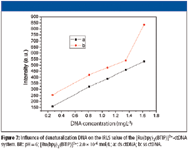 The ctDNA was purchased from Sigma Co. (China). Stock solution of nucleic acid was prepared by dissolving ctDNA in doubly distilled water. This stock needed to be stored at 0–4 °C with only an occasional gentle shake if needed. The solution of ctDNA gave a ratio of UV absorbance of 1.8–1.9 at 260 and 280 nm, indicating that the ctDNA was sufficiently free of protein. The concentration of ctDNA is calculated based upon the absorption at 260 nm (50.0 mg/Lper OD). In this experiment, all working solution of DNA is 27.0 mg/L