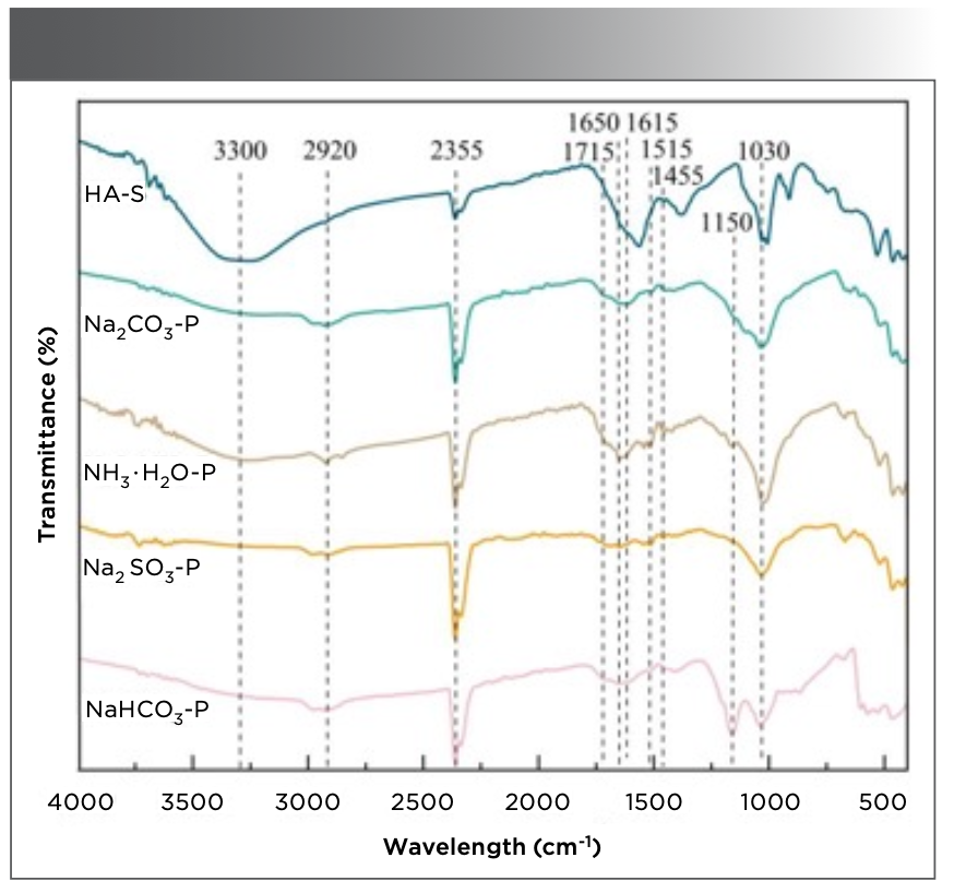 Figure 3 shows the FT-IR spectra of different humic acids at 4000−400 cm−1. PHA is observed to have the same characteristic absorption peaks as HA-S, confirming that the substances contain the same functional groups. At 3650 cm−1, there is a sharp absorption peak, indicating the stretching vibration of the free hydroxyl group in which the peak areas of all spectra are in the order of HA−S > NH3·H2O−P > Na2SO3−P > Na2CO3−P > NaHCO3−P. A broad absorption peak at 3500−3200 cm−1 represents the stretching vibration of intermolecular hydrogen bonds (phenols, alcohols, and carboxylic acids). The peak areas are in the order of HA−S > NH3·H2O−P > Na2CO3−P > NaHCO3−P > Na2SO3−P. This indicates that the hydroxyl structure of PHA extracted with NH3·H2O has the greatest yield. The absorption peaks of the humic acids appear at 2960, 2920, 2870, and 2850 cm−1 corresponding to the symmetric and antisymmetric vibrations of methyl and methylene, respectively (27). The peak at 2355 cm−1 is attributed to the atmospheric carbon dioxide.