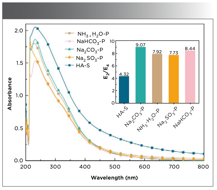 Rodríguez (25) concluded that a larger E2/E4 ratio resulted in a lower degree of the aromatic ring condensation of humic acid. As shown in Figure 2, the E2/E4 ratio of HA−S is the smallest at 4.32, and the E2/E4 ratio of PHA is greater than that of HA−S. Chen and associates (26) found that the higher E2/E4 ratio was related to the carbonyl group. The largest E2/E4 ratio is determined to be 9.07 for Na2CO3−P. This indicates that the PHA extracted using Na2CO3 has the lowest aromaticity and molecular weight and a higher concentration of carbonyl structures. The E2/E4 ratio of NH3·H2O−P and Na2CO3−P are similar, indicating that the contents of the benzene ring, carbonyl groups, and molecular weights are similar in PHA when NH3·H2O and Na2SO3 are used as extractants.