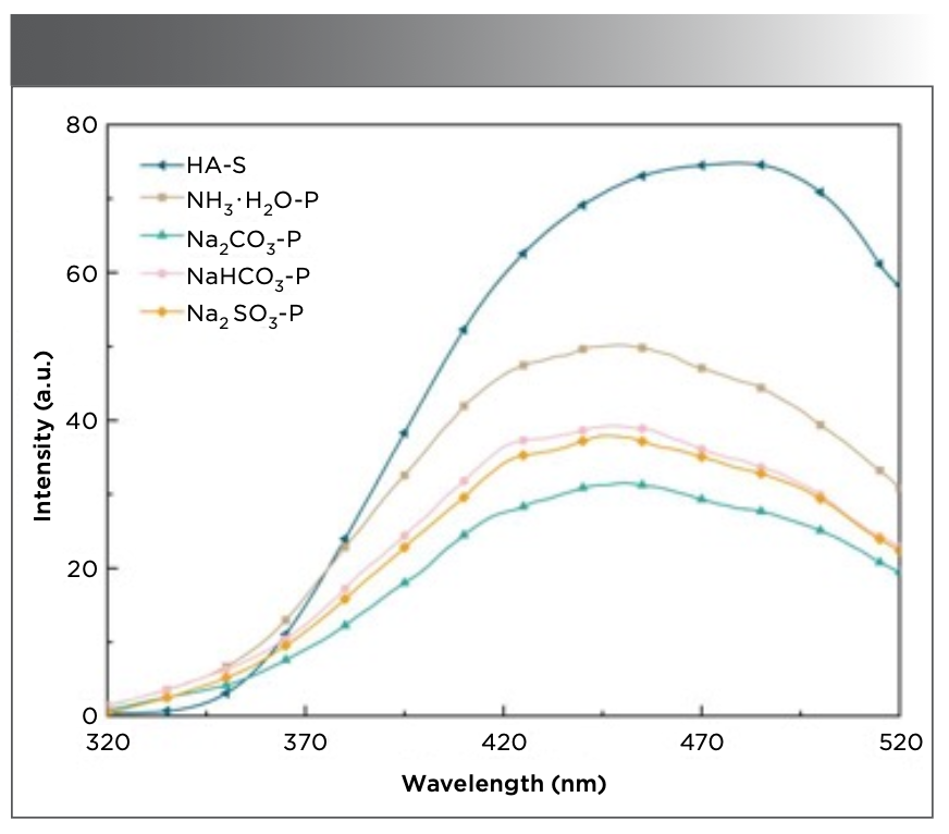 Figure 4 shows the fluorescence emission spectra of the various humic acids at a fixed excitation wavelength of 274 nm. Compared with that of HA−S (479 nm), the fluorescence peak of PHA has different degrees of blue shift (Na2CO3−P at 450 nm, NH3·H2O−P at 449 nm, NaHCO3−P at 448 nm, and Na2SO3−P at 446 nm). This indicates that the molecular structures of the humic acids obtained using the different extractants are varied. Due to the fewer aromatic or heterocyclic rings in PHA, the degree of π-electron conjugation is smaller (31), resulting in a larger blue shift. As PHA has fewer hydroxyl structures than HA−S, the degree of p→π conjugation in PHA is less than that in HA−S, resulting in a considerably lower fluorescence intensity. Humic acids extracted by alkali-extraction and acid-precipitation contain more electron-withdrawing substituents (carbonyl and carboxyl), which weaken the fluorescence intensity of PHA. Figure 4 shows the fluorescent signals of the different humic acids, with the fluorescence intensities in the order of NH3·H2O−P > NaHCO3−P > Na2SO3−P > Na2CO3−P. This confirms that the hydroxyl (electron-donating group) content of the PHA extracted using NH3·H2O is greater than that of using NaHCO3−P. Na2CO3 extraction of PHA carbonyl and carboxyl content is also found to be higher. This supports the conclusions drawn from the UV-vis and FT-IR spectra.