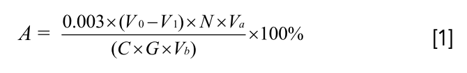 Where A is the humic acid content, %; 0.003 is a coefficient indicating the milligram equivalent of carbon, g; V0 is the consumption of ferrous ammonium sulfate in the control group, mL; V1 is the consumption of ferrous ammonium sulfate in the test group, mL; N is the concentration of ferrous ammonium sulfate, mol/L; C is 0.58, indicating the conversion factor for the PHA carbon ratio; G is the weight of the humic acid sample, g; Va is the total volume of humic acid solution, mL; and Vb is the volume of humic acid solution used in titration, mL.