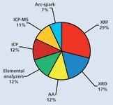 X-ray diffraction (XRD) is forecast to be the fastest growing technique, with growth approaching 5% for the year. XRD currently makes up about 17% of the atomic spectroscopy market (Figure 5). Unlike most atomic spectroscopy techniques, XRD is not primarily used for elemental composition; rather it is used to determine or identify molecular structures, or both. XRD has strong research applications in academic, government, and industrial laboratories in pharmaceuticals and biotechnology. Although budget constraints are affecting those markets, XRD continues to evolve as a technique with more automation and larger, faster detectors offering better performance, boosting both the price and demand for new systems.