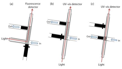 Absorbance and fluorescence measurements can be carried out in the flow cell that is integrated within an LOV module by means of optical fibers. The distance between the optical fiber ends defines the optical pathlength, which can be varied from 1 mm (Figure 4b) to 10 mm (Figure 4c). Fluorescence measurements (Figure 4a) are carried with optical fibers assembled at a 90° angle.