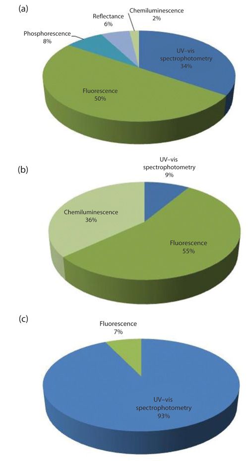 According to Figures 3a and 3b, fluorescence is the most common detection method in FIA and SIA techniques for flow-through SPS. Fluorescence is more sensitive and selective than UV–vis spectrophotometry; it is subject to less influence from the solid material background signal and interferences from the sample matrix.