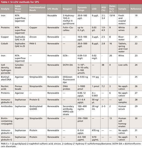 As shown in Table I, the SI-LOV-SPS methods were applied to samples with complex matrices such as human serum, wine, and fresh and coastal waters. In fact, the more recent works (19,21,22) were applied to water samples, showing the increased need for new and more sensitive methods that can be applied to these complex samples. The presented works describe the efficient removal of potential sample matrix interferences and the methods were successfully applied to the determination of the analyte of interest at trace levels. In fact, limits of detection at the microgram-per-liter level were achieved, demonstrating the increased sensitivity and selectivity obtained when performing flow-through SPS.