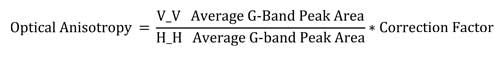 Each boxed area in Figure 4 is 11 x 47 µm (517 sq. µm) with spectra collected at a spatial resolution (pixel size) of 0.3 µm; this comes out to ~1800 individual spectra. Therefore, each boxed area produces a single Raman spectrum representing the averaged sample area. We calculated the peak area of the G-Band from the averaged spectrum collected at each polarization configuration (V_V, H_H) and took the ratio. A correction factor was applied to compensate for the reduced optical throughput in the H_H configuration. This correction factor is calculated from the silicon peak at 519 cm-1 Raman shift which is not sensitive to polarization.
