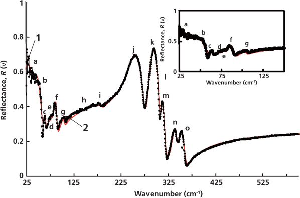 Reflectance spectra of Zn3P2 single crystals were measured at 300 K in the 25–600 cm-1 range, using a Bruker IFS 66v/s spectrometer with an Hg lamp as the source of unpolarized radiation with a resolution of 0.5 cm-1; 256 scans per 20 s were collected in each experiment. A gold mirror (a 300-nm-thick layer of gold, deposited on glass) with a reflectance index of 0.99 in the far IR served as a reference for reflectance measurements. Reflectance spectra of reference and investigated samples were measured sequentially. The final spectrum is a result of division of the sample's spectrum by the spectrum of reference. The angle of incidence of radiation was less than 10°.