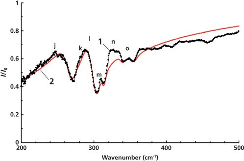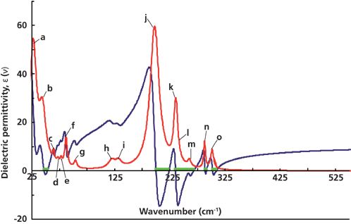 The experimental reflectance spectrum of Zn3P2 is presented in Figure 1 (curve 1) and shows 15 peaks in the studied spectral range. This spectrum is of the form that is similar to the data shown in reference 3, namely, two peaks at 257 cm-1 and 296 cm-1 with a "shoulder" at 312 cm-1, two small peaks at 340 cm-1 and 354 cm-1, and some small peaks below 125 cm-1. The reflectance coefficient at wavenumbers greater than 550 cm-1 is R(ν) ≤ 0.24. Unlike the study presented in reference 3, we examined the reflectance at wavenumbers as high as 600 cm-1, which leads to a better determination of ε∞. The reflectance spectrum was compared to the theoretical spectrum (curve 2) using an analysis of variance. Figure 1 demonstrates a good agreement between the theoretical and experimental results. This agreement enabled us to develop a mathematical model for the reflection spectra of Zn3P2. Dispersion of the dielectric permittivity of Zn3P2 single crystal obtained from the calculated reflectance spectrum is presented in Figure 2. In this figure, curve 1 corresponds to the dispersion of the real part of the dielectric permittivity and curve 2 corresponds to the imaginary part. Spectral ranges where ε1 has negative values (and where surface polaritons can be excited) are marked with a bold green line.