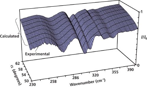 Here we present, for the first time, the results of our investigation of surface phonon polaritons in Zn3P2. ATR is one of the experimental techniques used for studying surface polaritons. Figure 3 shows an experimental ATR spectrum of Zn3P2 (curve 1) measured at α = 50° (angle of incidence for an ATR unit). Curve 2 corresponds to the simulated ATR spectrum. The ATR surface R(ν, α) shown in Figure 4 is a three-dimensional presentation of the system transmission that depends on the radiation frequency ν and angle α. It consists of eight ATR spectra: The first one is experimental (α = 50°), and the others are calculated (α = 52 ÷ 64°).
