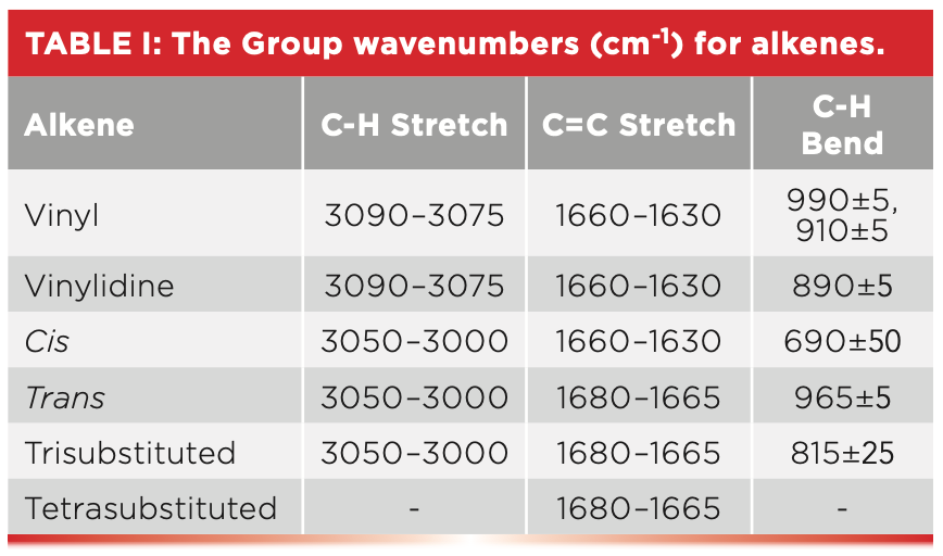 Another important group wavenumber for alkenes is the C=C stretch. This C=C stretch typically falls from 1680 to 1630 cm-1 and is somewhat sensitive to the substitution pattern (5). As seen in Table I, cis-C=C stretches fall from 1660 to 1630 cm-1, whereas for trans- and tri-substituted alkenes these peaks appear in the 1680–1665 cm-1 range.