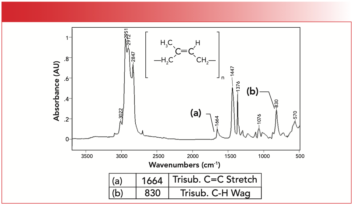 In our ongoing survey of the infrared (IR) spectra of polymers, we now turn our attention to rubbers. Many of these materials have C=C bonds, giving us the opportunity to review how to use IR spectroscopy to distinguish between the six types of alkenes. We also examine the spectra of rubbery materials in detail, such as synthetic rubber, natural rubber, and trans-butadiene rubber.