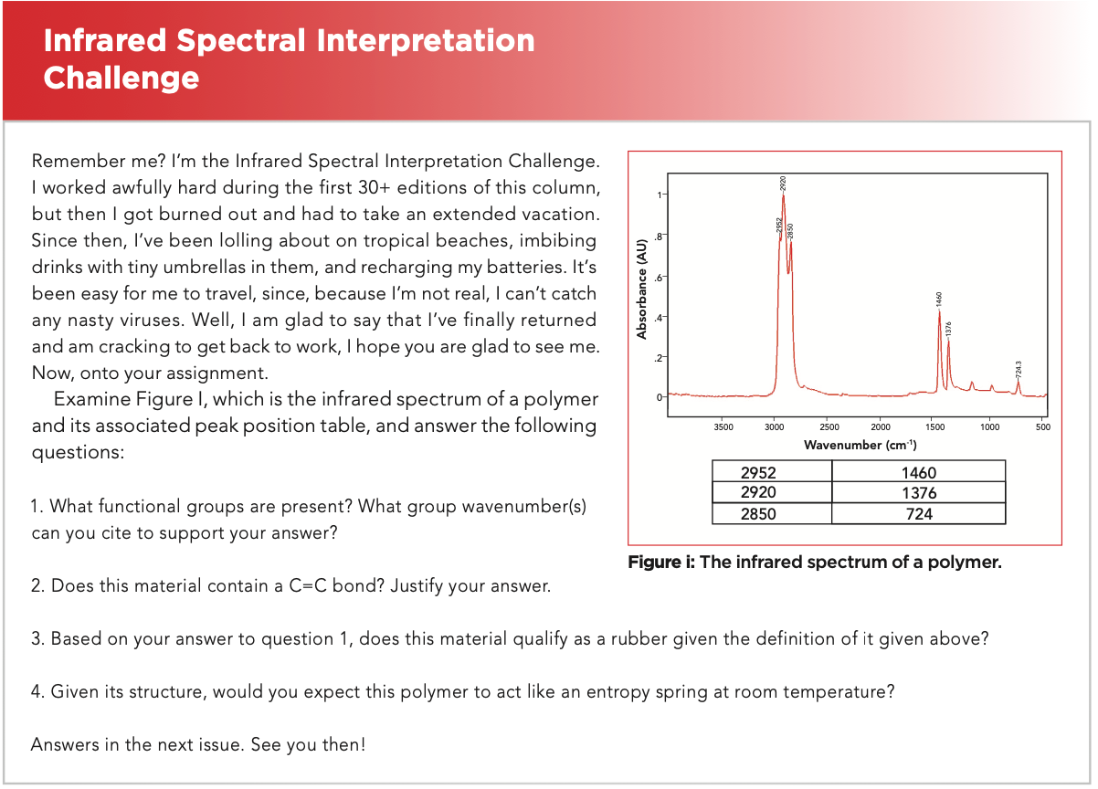 As I have mentioned in previous columns in this series, the infrared (IR) spectra of polymers are not unique; the spectrum of a functional group generally looks the same whether it is contained in a polymer or in a small molecule. Thus, our study of polymer spectra is an excellent opportunity to review functional group spectra from previous columns.
