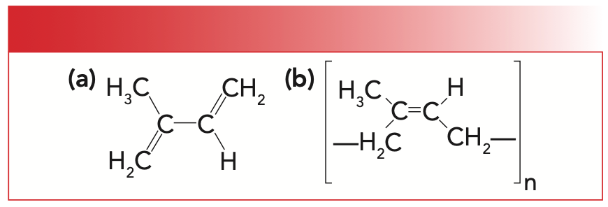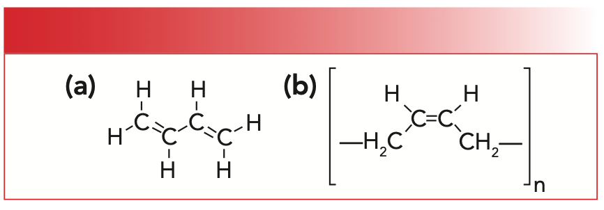 Because the price of natural rubber at times has been high because of the scarcity of its raw material, chemists devised a way to make many different synthetic rubbers. For our purposes, synthetic rubber will mean poly-cis-1,4-butadiene, which is made from a butadiene monomer. The structures of this monomer and its corresponding polymer are shown in Figure 2.
