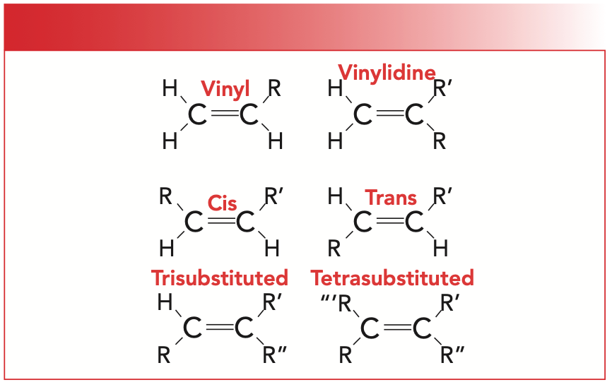 The number and position of the substituents around the C=C bond of an alkene lead to six different substitution patterns, which are illustrated in Figure 3. The “R-” group in the illustration is a non-hydrogen substituent, typically carbon.
