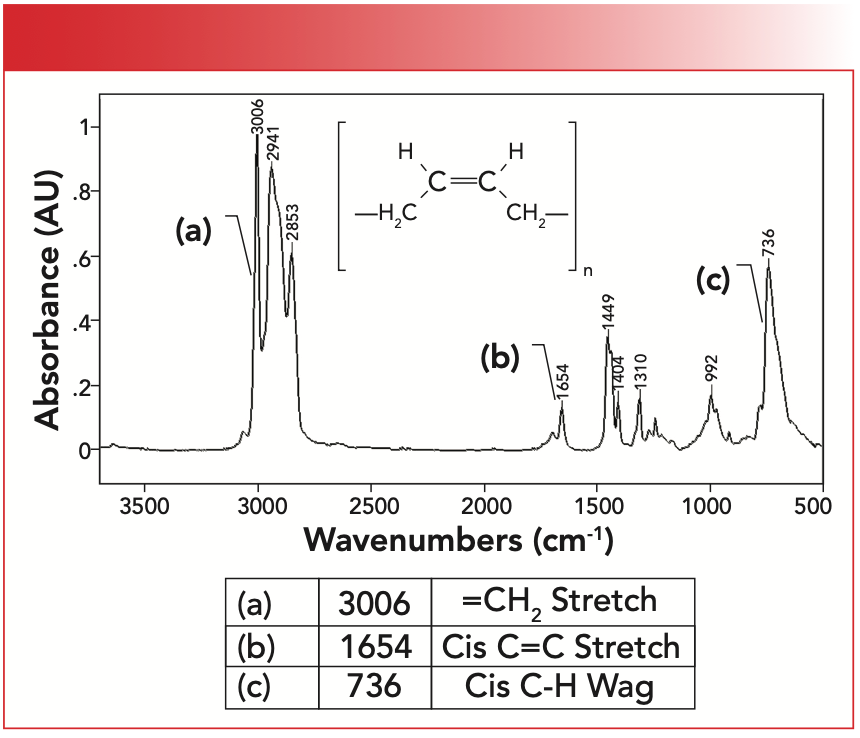 The IR spectrum of synthetic rubber is seen in Figure 4. Note that this structure contains cis-functional groups, which means that like substituents are on the same side; that is, the two CH2 substituents are on one side of the double bond while the two hydrogens are on the other side.