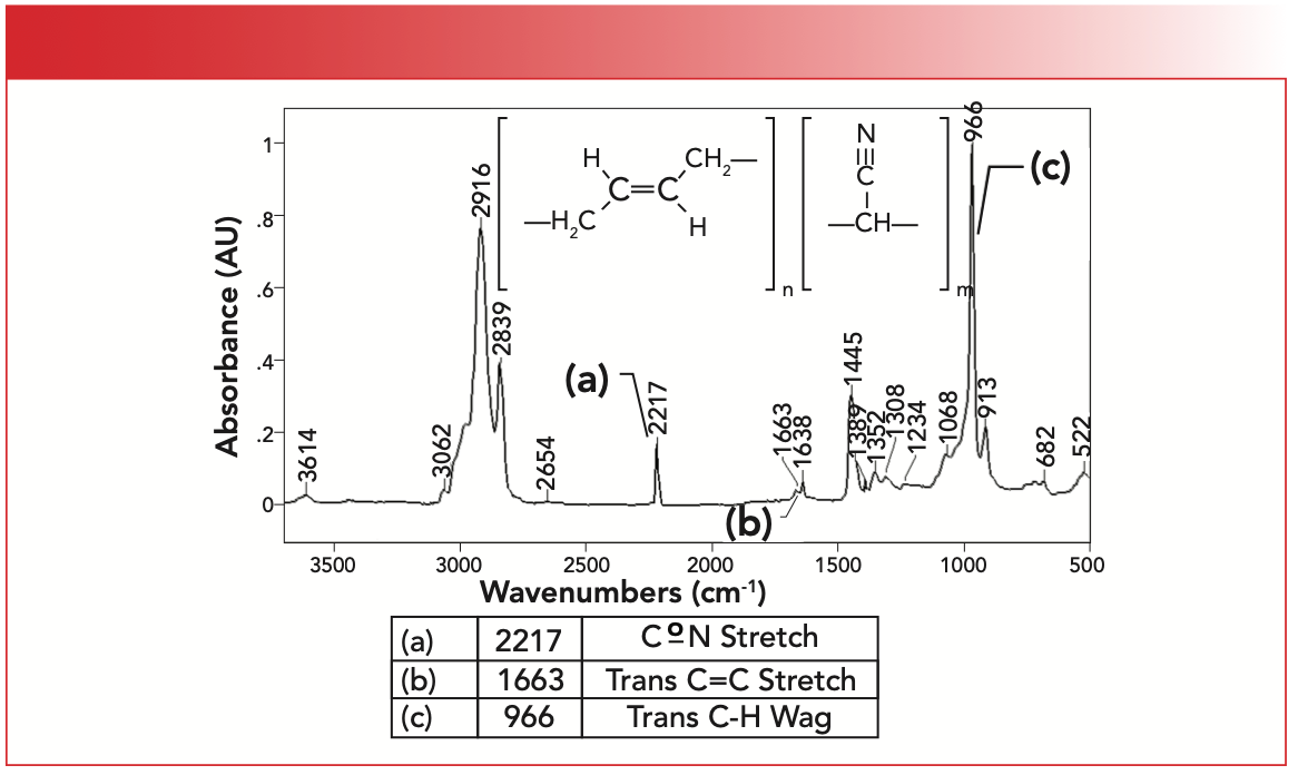The unsaturated C-H stretch for the C=C bonds is seen at 3062 cm-1, whereas the alkene double bond stretch is labeled B and appears at 1663 cm-1. What stands out in this spectrum is the intense, sharp trans-C-H wagging peak labeled C at 966 cm-1. Note that this is the biggest peak in the spectrum. The acrylonitrile portion of the polymer gives rise to a CoN stretching peak labeled A at 2217 cm-1. We studied nitriles and their spectra in a previous column (7). Trans-butadiene rubber contains methylene groups only, so only two C-H stretching peaks between 3000 and 2850 cm-1 are present, as expected (6).
