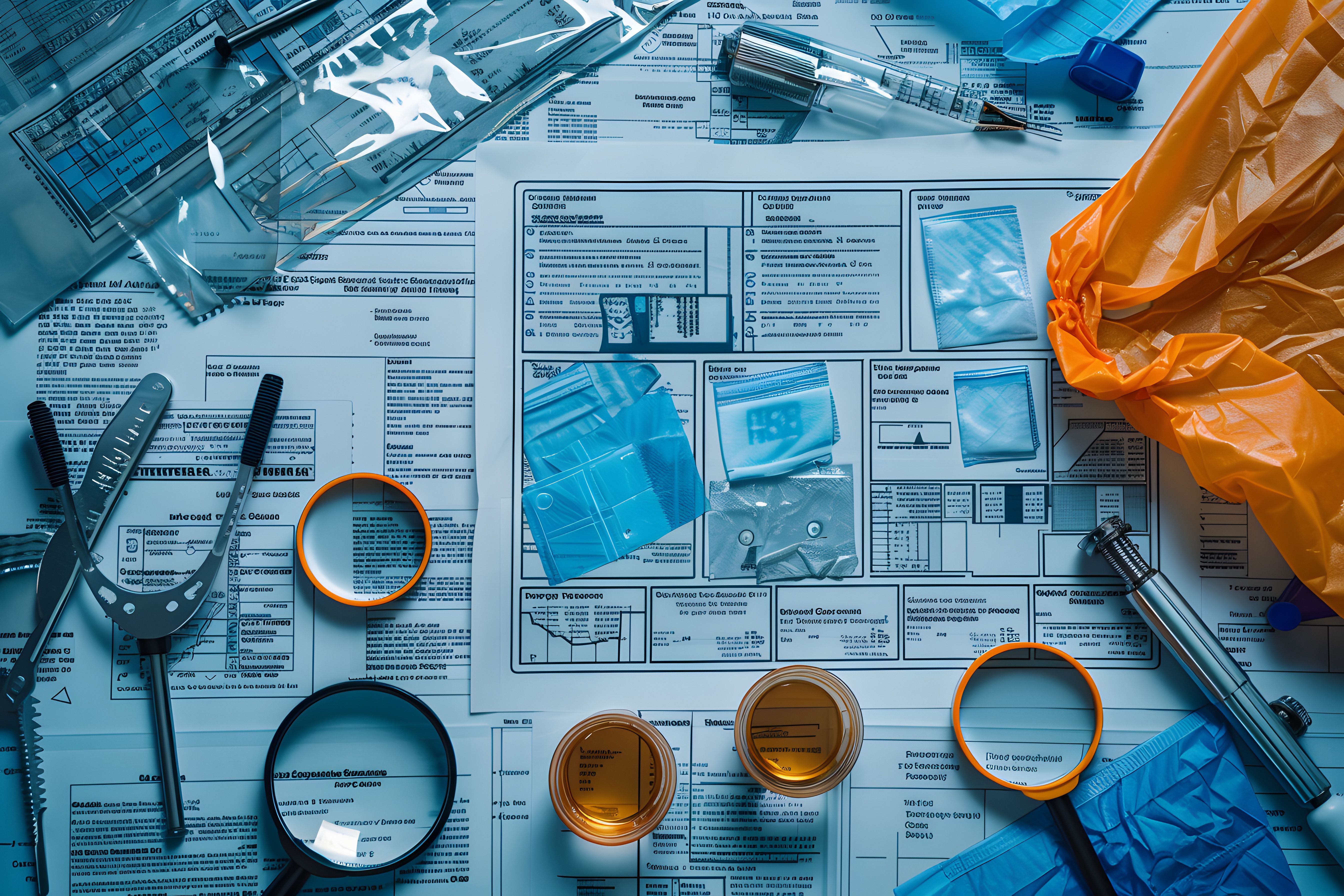 Forensic investigation tools on evidence table, crime scene equipment, magnifier, gloves, tape, forensic science supplies, criminal evidence documentation background. Generated with AI. | Image Credit: © Ram - stock.adobe.com