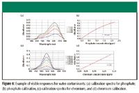 With this in mind, one also can look at a number of standard methods of analysis and implement these within a single package by combining the spectral sensor with sample conditioning steps that include the interaction with standard chemical reagents, indicated, in concept, by Figure 5. This approach can bring on-line many standard methods of analysis within a single analytical platform because of the ability to program the sensor for different methods and reagent combinations. A classical example here is the analysis, by spectral or colorimetric methods, of water for quality and potential contamination. Figure 6 provides data obtained directly from a prototype microspectral sensor system for the analysis of phosphate and chromium(VI) in water. These two are important contaminants and are critical analytes for water quality testing from natural water resources. They are just two of many examples of water quality measurements possible with integrated sampling–spectral sensor measurement systems. Note that a NeSSI platform is used to set the stage for the concept of an integrated measurement system. However, for dedicated applications such as water quality monitoring, the integration of the spectral sensor with a custom-designed reagent dosing unit (for multiple reagents) can provide an optimized measurement package.