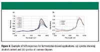 Many analyses do not require special chemical reagents to meet the requirements of a particular measurement. Many compounds are naturally colored, and so measurements can be made directly on materials containing such substances. Also, many additional analyses can be performed in the NIR. The short-wave NIR region has been used for many industrial measurements, with dedicated process analyzers, for chemical and petrochemical and for food and beverage applications. The microspectral sensor system is available in an NIR version, which can be used on its own or integrated into a NeSSI type of sampling system for on-line measurements of chemical composition and chemical–physical properties. Some examples are provided in Figures 7 and 8, where microspectral sensing can be used to monitor changes in composition, or to measure specific properties, such as alcohol content of fermentation products.