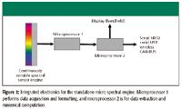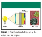 Currently, configurations covering the visible and NIR spectral regions are in use. Figure 1 is a generic representation of the key components of a microspectral measurement system (1). While these are the functional elements (source, sample, and detection system), they are not the full implementation of a spectral engine. The separation here between an instrument and a spectral sensor is the ability to control the entire process of data logging and spectral data extraction onboard the device by dedicated electronics (Figure 2). In such a system, the raw signal from the spectrally configured detector is acquired and conditioned into a spectral measurement space based on wavelength and spectral intensity (absolute or relative).