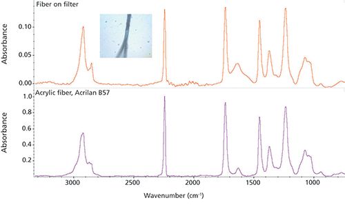 Four point-and-shoot examples are shown in Figures 1–3. The fiber or particle was located visually and then centered in the aperture. The Ge-ATR accessory was then brought into contact with the particle. With Ge-ATR, there is a fourfold increase in magnification (because of its high index of refraction). The FT-IR microscope has a 10× magnification; with the Ge-ATR accessory the magnification increases to 40×. The standard 1-mm circular pinhole thus results in an effective aperture at the sample of 25 µm. As most microplastics are this size or larger, this ensures good spectral purity.
