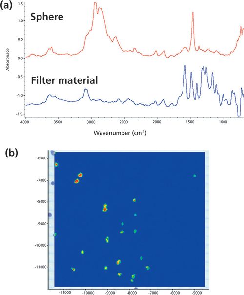 These first few examples entailed point and shoot analysis (find, target, collect, analyze). Point and shoot can be done on simple, manual FT-IR microscopes. Automation enables the analyst to obtain a wider picture-a map or image-of a sample, such as the one shown in Figure 4. For this study, a liquid suspension of standard polyethylene spheres was made and then filtered. The filter, after drying, was placed on a piece of double stick tape (to flatten and hold the filter), then inserted into an automated microscope with no further sample preparation. The visual image consists of more than 200 video captures combined into a mosaic covering approximately 1 cm2. There were 17,500 spectra collected (50 µm steps, 0.1 s/spectrum resulting in ~30 min for collection). Example spectra from the filter itself and the spheres are shown in the top of Figure 4.