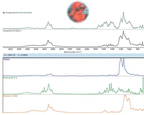 Such is the case here. The use of standard (single component) searching provides some clues, but this is clearly a mixture. The multicomponent searching shown in Figure 3 identified three classes of material: PTFE (the core composition of the component) along with an acrylic coating (maybe from paint) and a siloxane agent (a lubricant, most likely). The final composite search result is good but not perfect, assigning most of the peaks. Even with the discrepancies, the origin of the particle was easily tracked to a sliding joint in the device.
