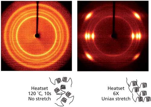 Figure 3: Two-dimensional XRD patterns collected from polypropylene films. Left pattern sample is annealed PP; right pattern sample is annealed and stretched PP (stretch direction is vertical).