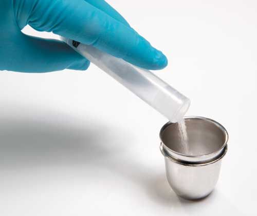 The flux is normally dispensed by taking it with a spatula from a bottle and adding it directly to a crucible sitting on an analytical balance to be weighed. The weighing process is tedious and time consuming, and requires skill and dexterity. It is also a source of fatigue, leading to human error, and can account for much of the error in the fusion process. The time involved in this process can be greatly reduced, in addition to eliminating the source of error from the flux weighing process, by pouring the flux from a vial containing the preweighed flux directly into the crucible (Figure 1). The amount of flux (weight) in the vial can be obtained in any quantity desired (7). The precision of the flux weight will be known, so the error involved in the process will be known and constant. The time spent on this process will be almost completely eliminated. In addition, the vials are individually sealed, thus providing better protection from humidity, dust, air, or other contaminants found in the typical laboratory.
