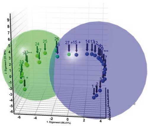 Figure 3: Principal component analysis (PCA) diagram from cluster-analysis of high-temperature investigation of Ca0•2Sr0•8 Al2O4.