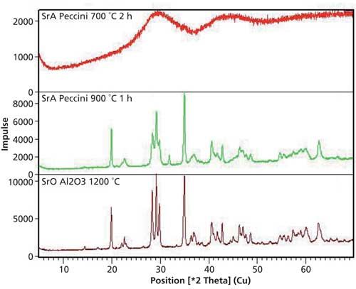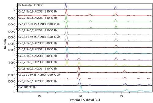 In the examples presented here, synthesis products have been investigated by X-ray powder diffraction methods for phase identification using an X´Pert Pro powder system with Cu-anode equipped with X´celerator or Pixcel detectors (PANalytical). All powder patterns were refined using Le Bail fits or by Rietveld method. Amorphous contents were determined by adding a 20% ZnO internal standard. The crystallization of the synthesis products was followed at different temperatures by XRD (Figure 1). Typical XRD diagrams showing solid solutions and end members in the monostrontium and monobarium aluminate system are shown in Figure 2.