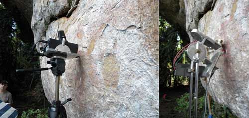 The Morro Azul Caves in Paraná State, Brazil (in two caves and a big rock shelter) were occupied three different times. The oldest occupation was by Umbu hunters and gatherers (from to 10,000 to 3000 years B.P.), whereas the two more recent were by Itararé-Taquara farmers and ceramists of the Jê linguistic family (from 4000 to 500 years B.P.). Rock art at this site was made over sandstones and diamictites, and the paintings present figures in red and black, almost always including animals, fantastic human representations, dotted lines, dots, semicircles, emblematic figures, and lattice motifs. In situ measurements with portable Raman spectroscopy and XRF systems were performed to characterize the pigments. Figure 1 shows the laboratory-made portable XRF and Raman spectroscopy systems in position to measure the “red bird” painting on the rock.