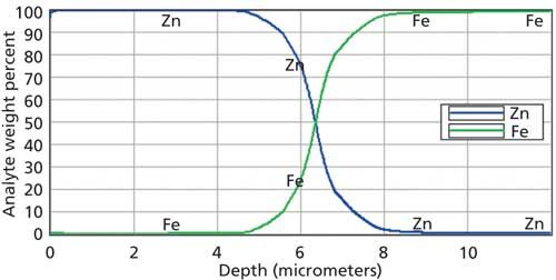 An example of a simple depth profile is a binary system such as zinc on steel, Figure 1 (original Figure 6). Data is collected starting at the surface of the specimen:
