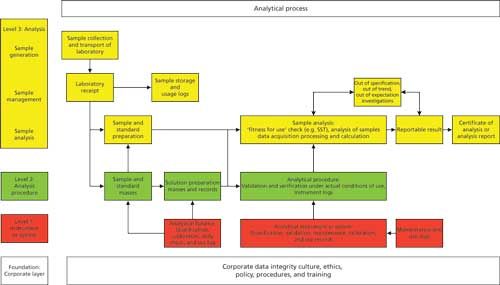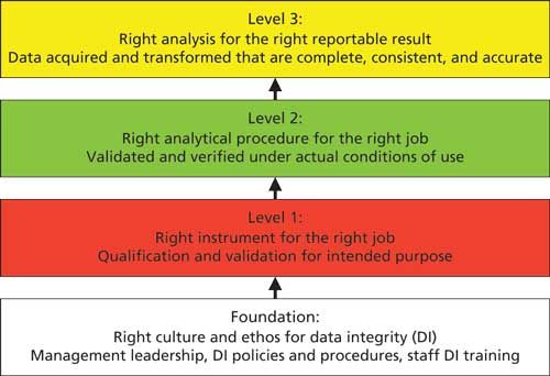 It is important to understand that laboratory data integrity must be thought of in the context of analysis of samples within an analytical process that is operating under the auspices of a pharmaceutical quality system (8,9). Data integrity does not exist in a vacuum. In formalizing a holistic approach to data integrity within an analytical context, I have chosen to look at four layers consisting of a foundation and three analytical layers above it in a data integrity model.