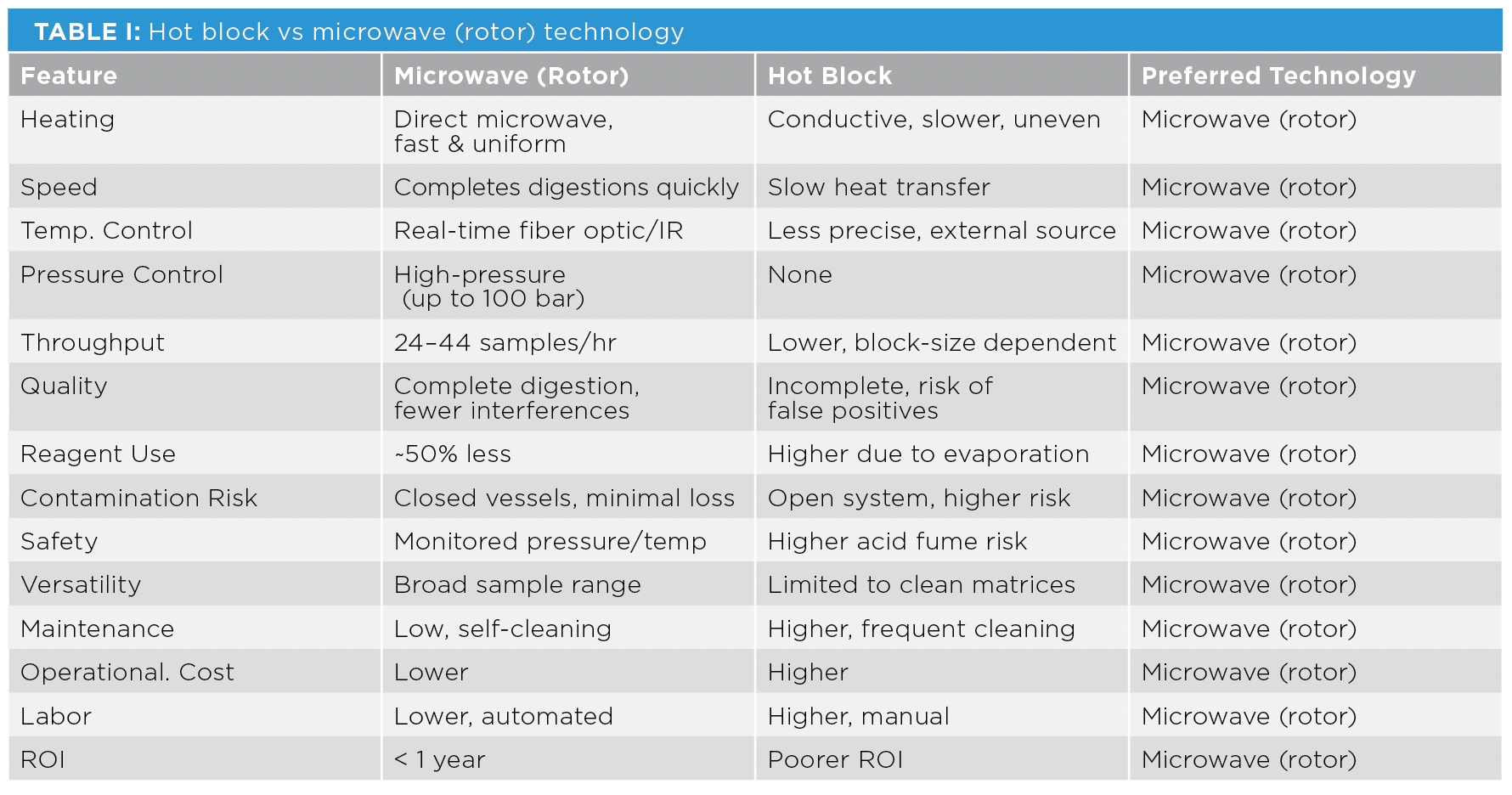 Traditional sample digestion methods, such as open-vessel hot plate or block digestion, have historically posed significant limitations in terms of time consumption, risk of contamination, operator variability, loss of volatile elements, and insufficient digestion of challenging matrices. See Table I for a comparison of hot block vs microwave (rotor-based) technology.