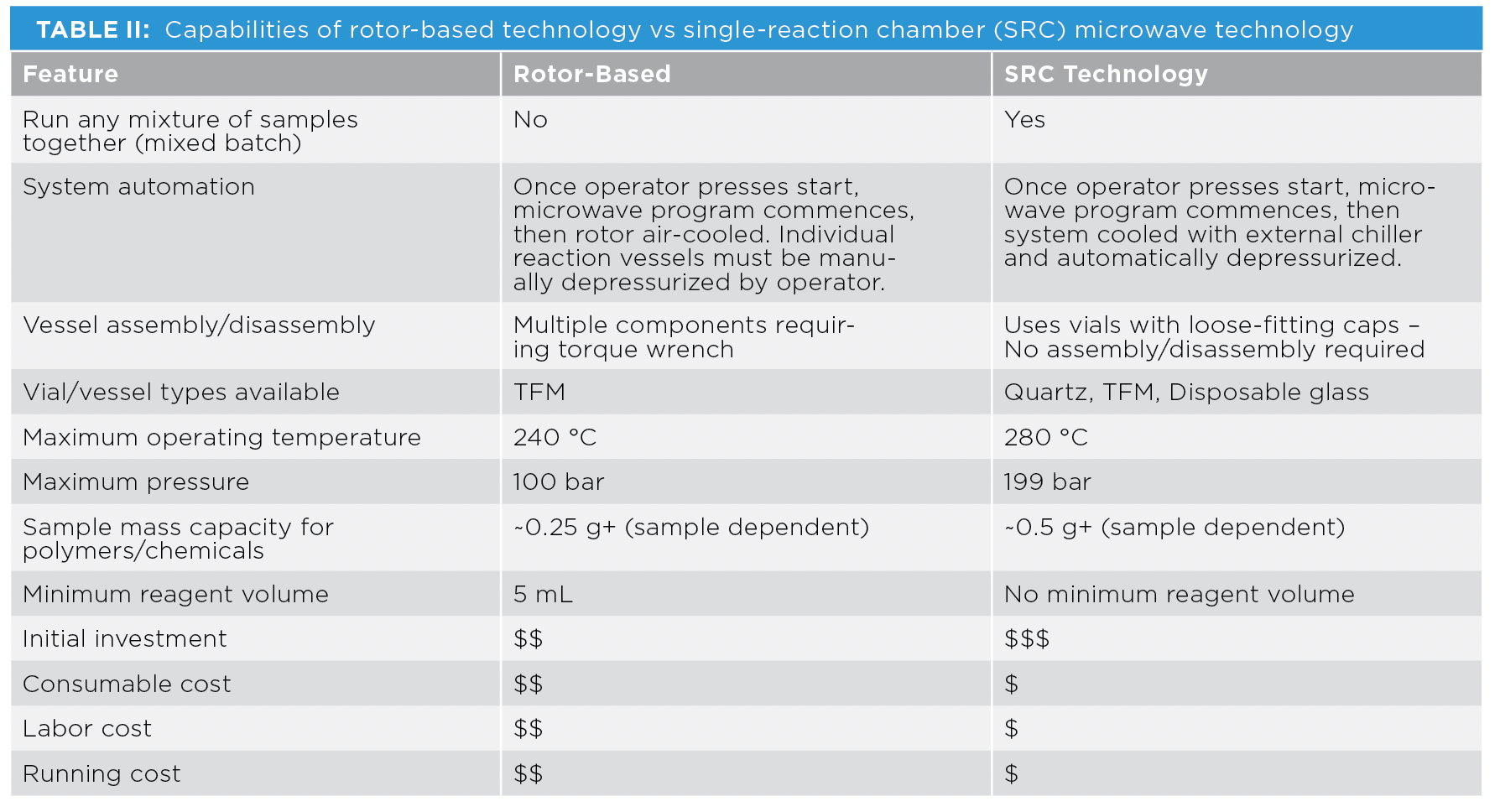 For laboratories with particularly challenging organic or inorganic matrices to digest, that are looking to improve throughput and safety as well as increase automation and reduce labor time and costs, SRC technology is another option worth considering. Comparison table of capabilities of rotor-based technology vs SRC technology is illustrated in Table II.
