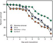 Figure 1: Survival over a 14-day postinfection period observed in cage-trials of honey bees infected with Nosema ceranae and IIV. Figure represents the combined survival results for four biological replications; N = 30 bees in each group for each biological replicate (1).