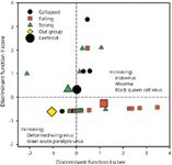 Stepwise discriminate function analysis of count-weighted occurrence data was undertaken to assess whether strong, failing, and collapsed colonies could be differentiated by specific patterns of pathogen occurrence (Figure 2). In the figure, function 1 explains 81% of the discriminating variance and contrasts a higher incidence of iridovirus (IIV), Nosema, and to a lesser extent, black queen cell virus (BQCV) in failing colonies with a higher incidence of deformed wing virus (DWV) and some Israel acute paralysis virus (IAPV) in the remaining groups. Thus, only two pathogens, namely IIV and DWV, were necessary for significant discrimination among different colonies. A noteworthy finding was that collapsed and strong colonies were not significantly different; however, this finding can be easily explained as the few bees left in colonies at the final stages of collapse are those that are not infected.