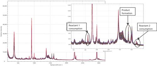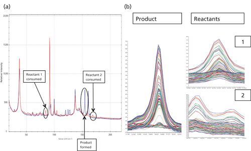 In the development of a process, there are many parameters that may be evaluated and experiments performed to optimize the yield, purity, and cycle time. To understand the impact of process changes on the process and product, in situ measurements can be made that relate the process parameters to product and process properties. In choosing measurement tools in process development, the needs of the chemical system in terms of “purpose, specificity, sensitivity, cycle time, on-line–off-line, qualitative–quantitative, accuracy, precision” must be defined and the proper technology that can fulfill the defined criteria must be chosen (4). In early phases of process development, qualitative information on reaction progress may be sufficient to gauge reaction completion. The trending of reactant- and product-relative concentrations based on peak height or area in a spectrum can be used to follow a reaction, even as other reaction parameter (such as solvent and other reagents or temperature) are changed from one reaction to another. In reactions where stoichiometric control is required, a quantitative measure of reactant concentrations may be needed. Off-line measurements by high performance liquid chromatography (HPLC) can be made and quantitative calibration models developed, but such models are matrix dependent and often require updating or redevelopment when the reaction matrix is changed.