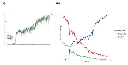 Figure 2: (a) Real-time peak trending of the two product peaks during the course of the reaction and (b) univariate peak trending plots using the (second derivative *-1 to remove any variation that might be coming from the baseline): red = 2-bromoacetophenone (reactant 1), green = 2-aminopyridine (reactant 2), and blue = final product: 2-phenylimidazo[1,2-a]pyridine synthesis.