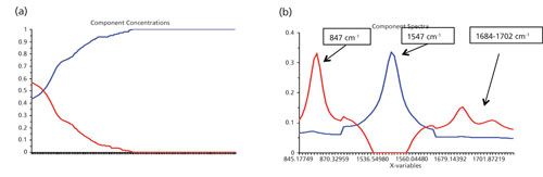 Figure 6: (a) The two component spectra and (b) two component concentration of the MCR results.