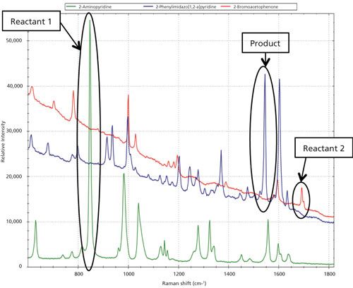 Two similar Sn2 reactions were monitored to understand the reactions and determine their reaction end point. In these chemical reactions for development of these medicinal chemistry compounds, the goal of the process monitoring was to have a qualitative trend of the reaction progress and a means to detect the reaction end point. The first reaction is 2-aminopryidine reacted with 2-bromoacetophenone to form 2-phenylimidazo[1,2-a]pyridine. For this reaction, a univariate approach of monitoring the reactant and product peaks was conducted using B&W Tek’s BWSP software. For the second reaction of 2-amino-5-methyl-pyridine and 2-bromoacetophenone to form 6-methyl-2-phenylimidazo[1,2-a]pyridine, a multivariate analysis method was applied using the Unscrambler software (CAMO Software). This approach also provided qualitative information, because there was no requirement of quantitation, but rather a real-time measure of reaction end point in place of previously used off-line TLC.